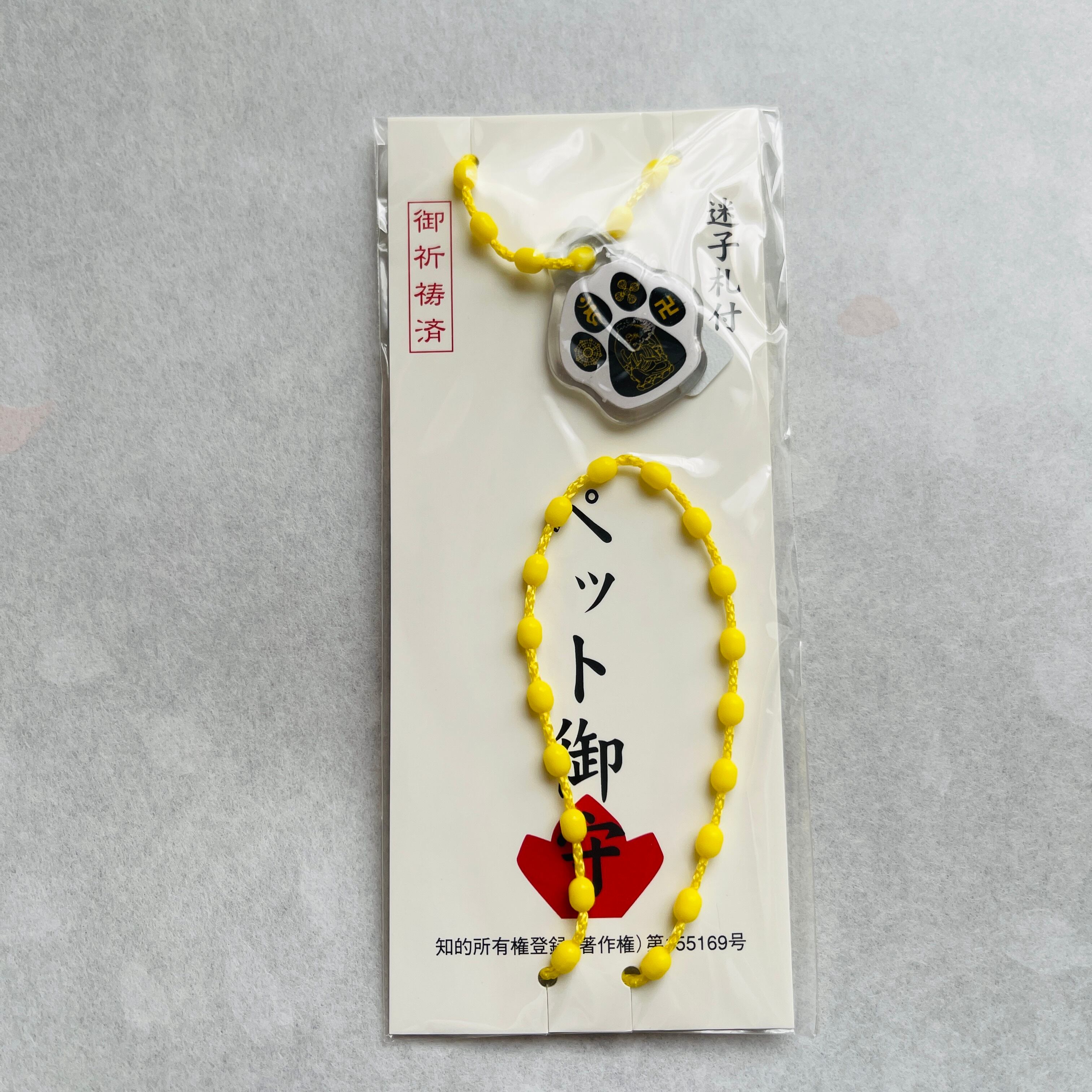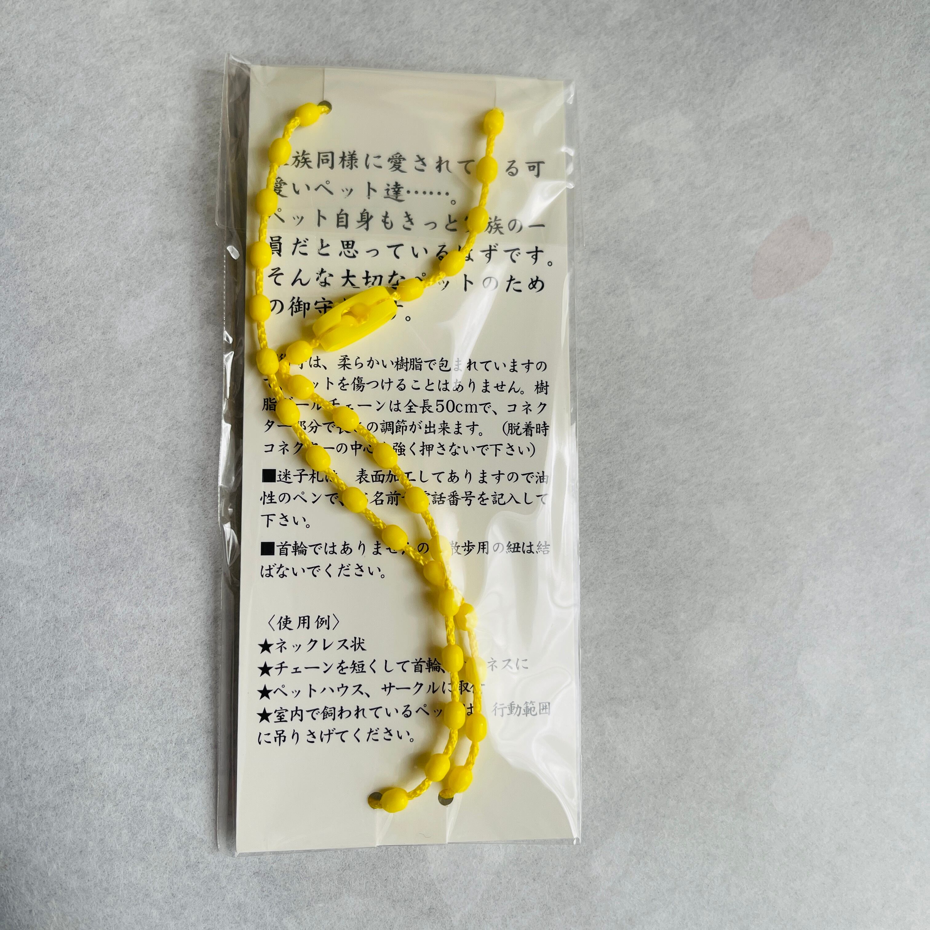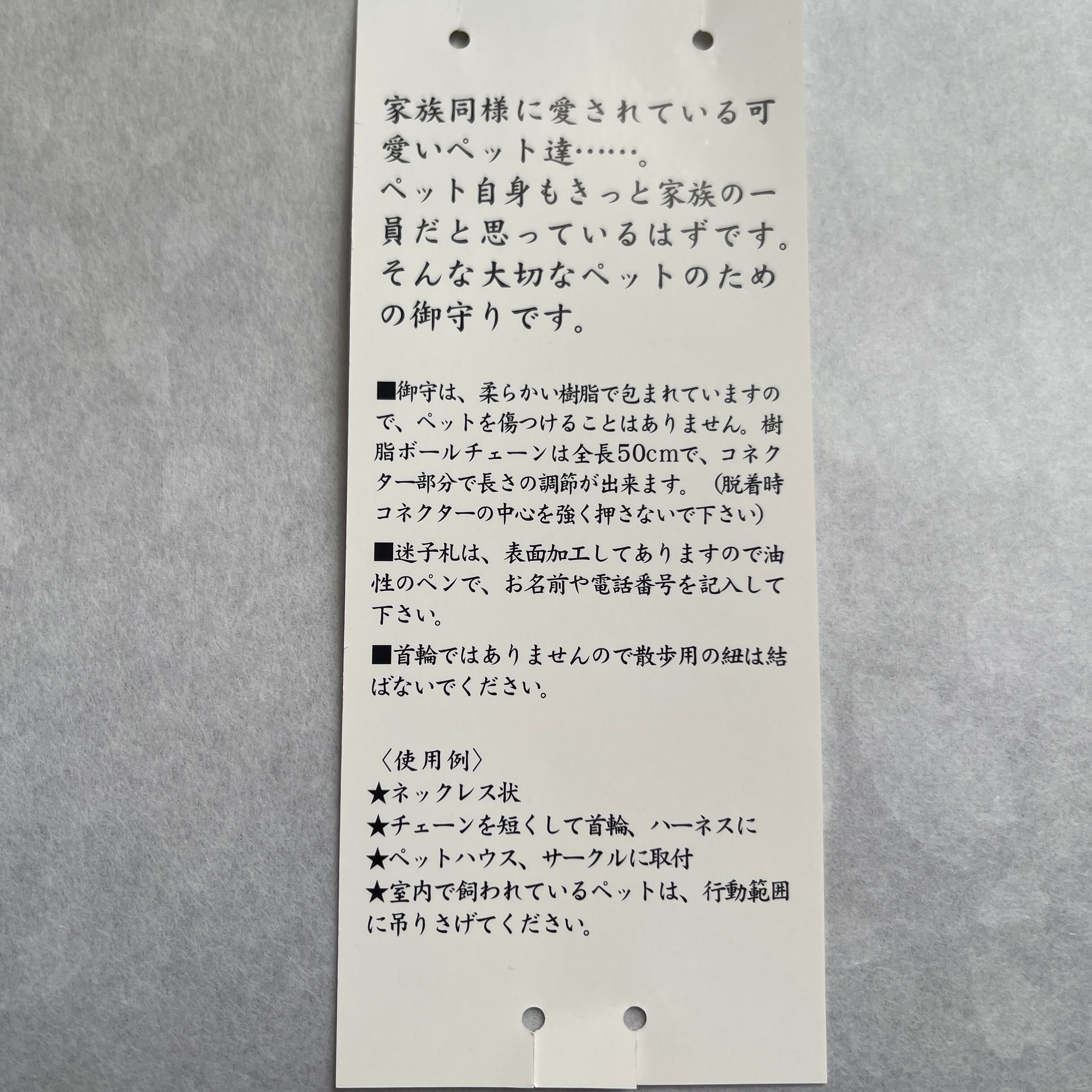 大切な愛犬や愛猫の健康と幸運を願う「ペット御守り 犬 猫 樹脂製」です。柔らかい樹脂で作られたこの御守りは、全長約50cmと持ち運びにも便利なサイズです。